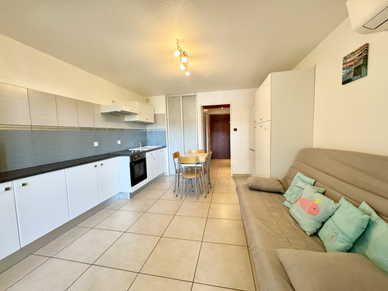 EXCLUSIVITÉ - A quelques pas du port et des plages, venez découvrir ce charmant studio cabine rénové et climatisé de 26m2 situé au 1er étage d'une résidence sécurisée, calme et bien entretenue. Il se compose d'un séjour / cuisine équipée donnant sur terrasse, placards, coin nuit avec lits superposés et salle de douche avec wc. Poss. d'être vendu meublé. Une place de parking privative complète ce bien. A voir sans tarder !