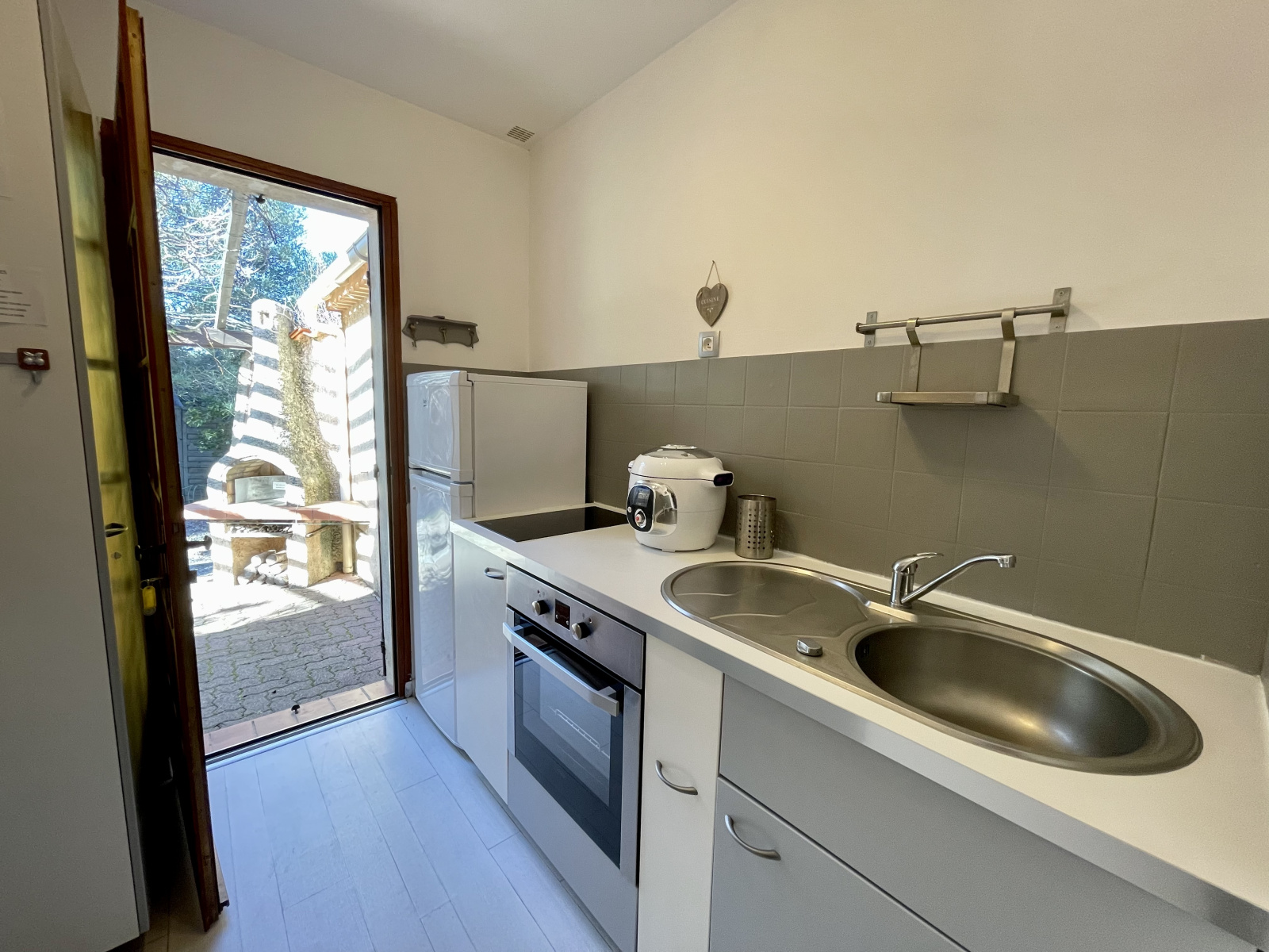 Proche du Brusc - A 10/12 minutes à pied du bord de mer, dans environnement calme et verdoyant, charmante petite maison T2 de 40m² de plain-pied, mitoyenne d'un côté, sur 240m² de terrain clos. Elle se compose d'une entrée, séjour et cuisine donnant sur terrasse Sud, chambre avec placard, salle de bains et wc. Un espace de couchage supplémentaire a été aménagé dans les combles. Un garage de 16m² complète l'ensemble. A voir sans tarder!
