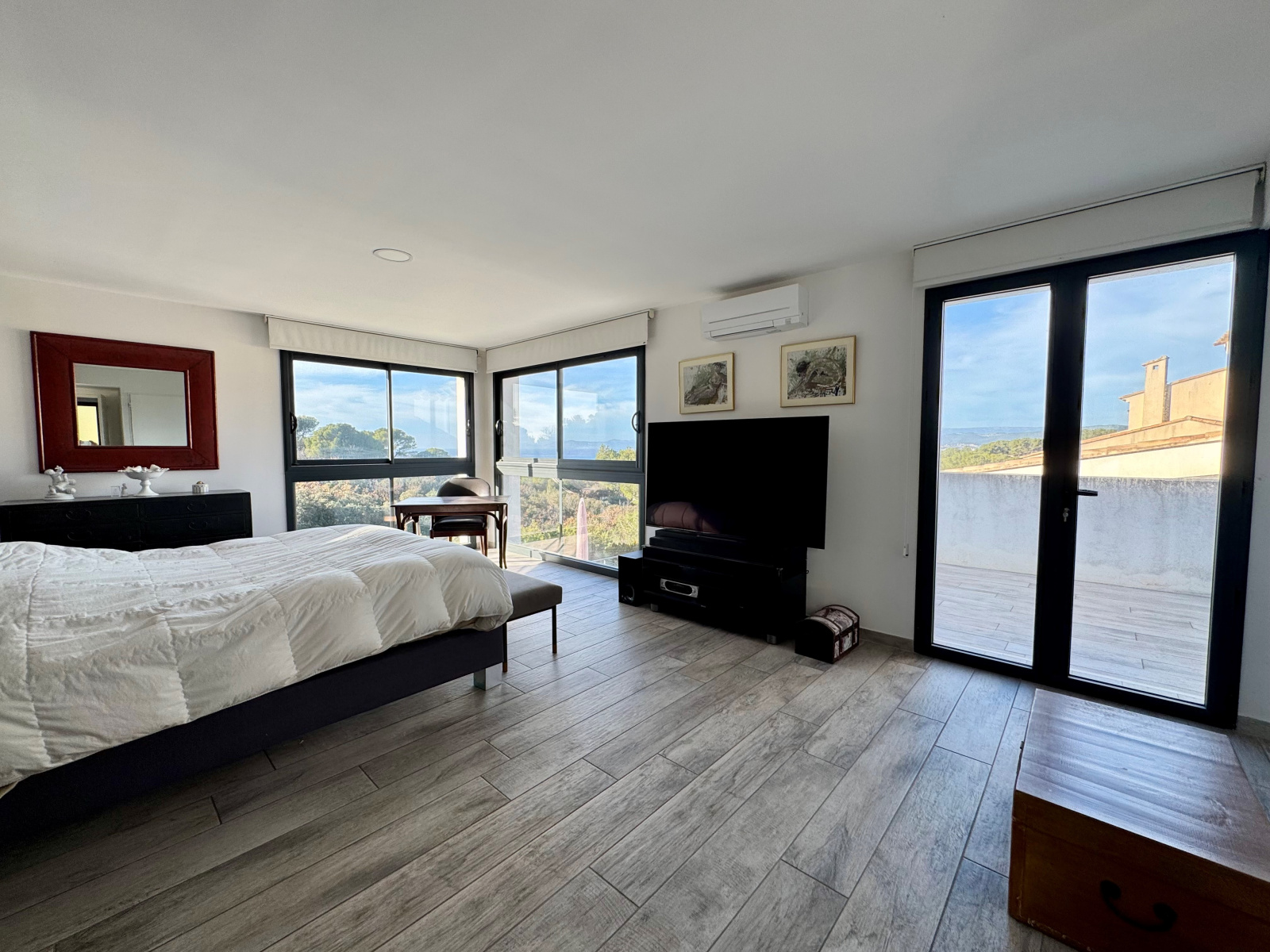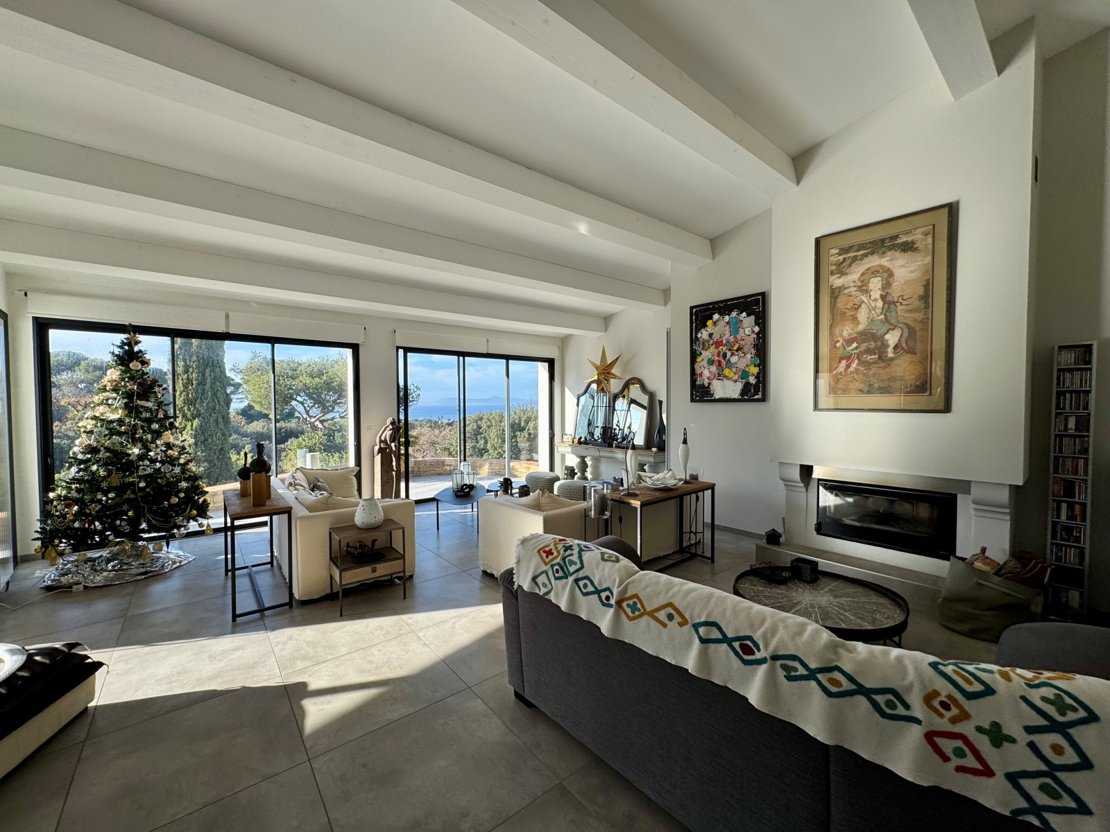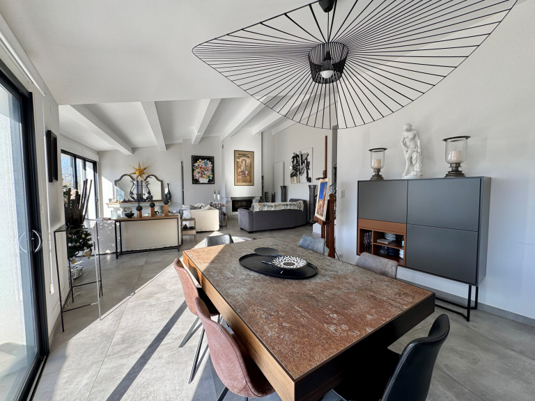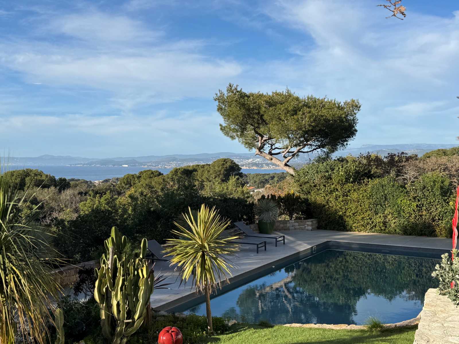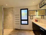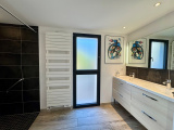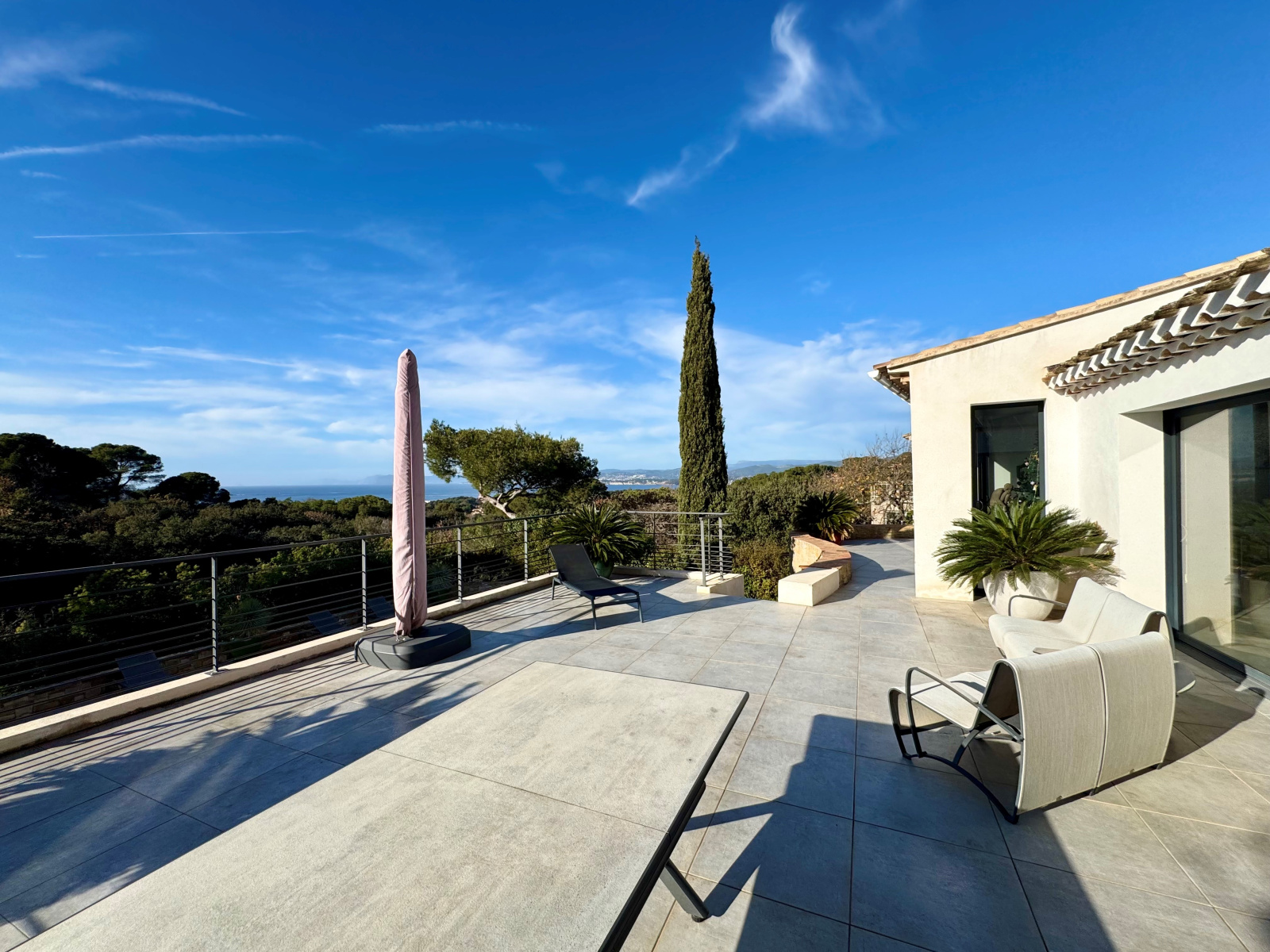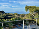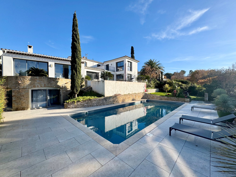 Dans domaine sécurisé de standing, venez découvrir cette très belle villa contemporaine entièrement rénovée de 247m² hab. sur 1.462m² de terrain, nichée dans un écrin de verdure. Située en position dominante, vous profiterez d'une vue panoramique sur la mer et les collines environnantes. Vous serez séduits par sa vaste pièce de réception avec plafond "cathédrale", ouvrant par de larges baies sur une agréable terrasse, sa grande cuisine entièrement équipée avec espace repas, et sa confortable suite parentale avec salle de douche privative. A l'étage, 1 suite avec salle de douche privative et solarium, 2 chambres se partageant une autre salle de douche et bureau. La piscine, bordée de larges plages, et sa cuisine d'été invitent à la détente et à la convivialité. Une annexe composée de 2 chambres d'appoint et salle de douche, ainsi qu'un garage complètent l'ensemble. A voir sans tarder !