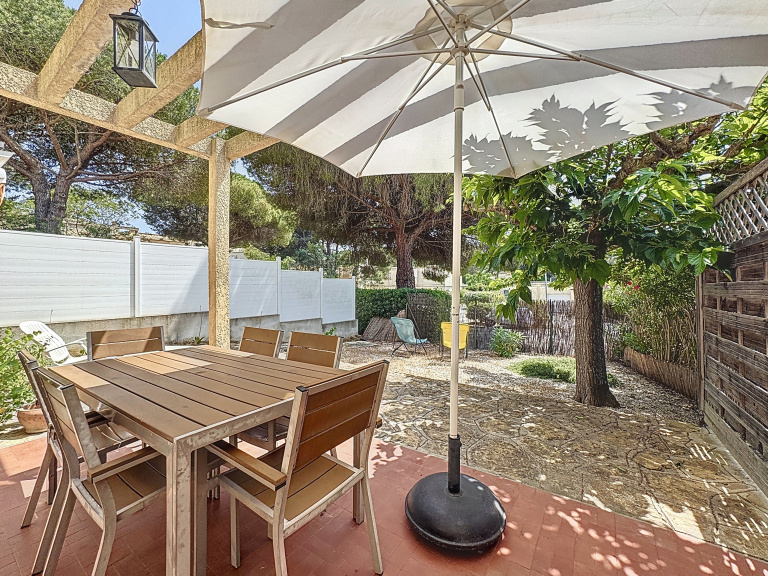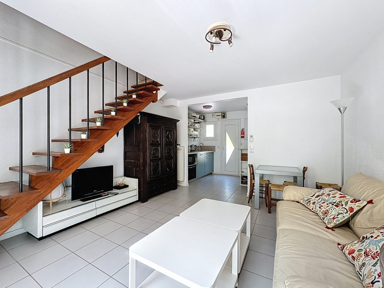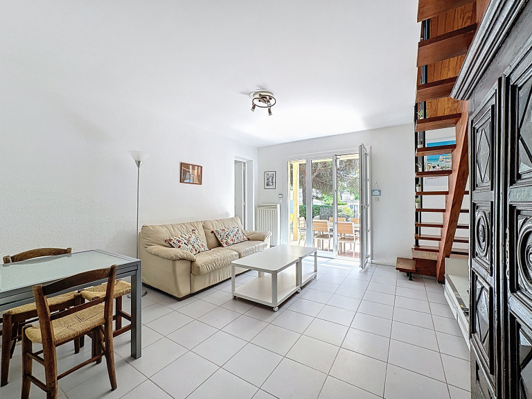 Esprit vacances pour cette villa-club de 53m² implantée au sein d'une résidence sécurisée, à 10 minutes à pied de la plage ! Cette maison, bien entretenue, offre de plain-pied un séjour ouvert sur une spacieuse terrasse prolongée d'un jardin orienté au Sud. La cuisine équipée est ouverte sur le séjour et profite d'une terrasse exposée Nord. Un coin nuit, une salle de douche et un wc indépendant complètent ce niveau. L'étage accueille quant à lui 2 chambres dont une avec douche, et un vaste solarium. Un garage et une place de stationnement complètent l'ensemble. Un bien idéal pour résidence secondaire ou investissement locatif. A visiter rapidement !