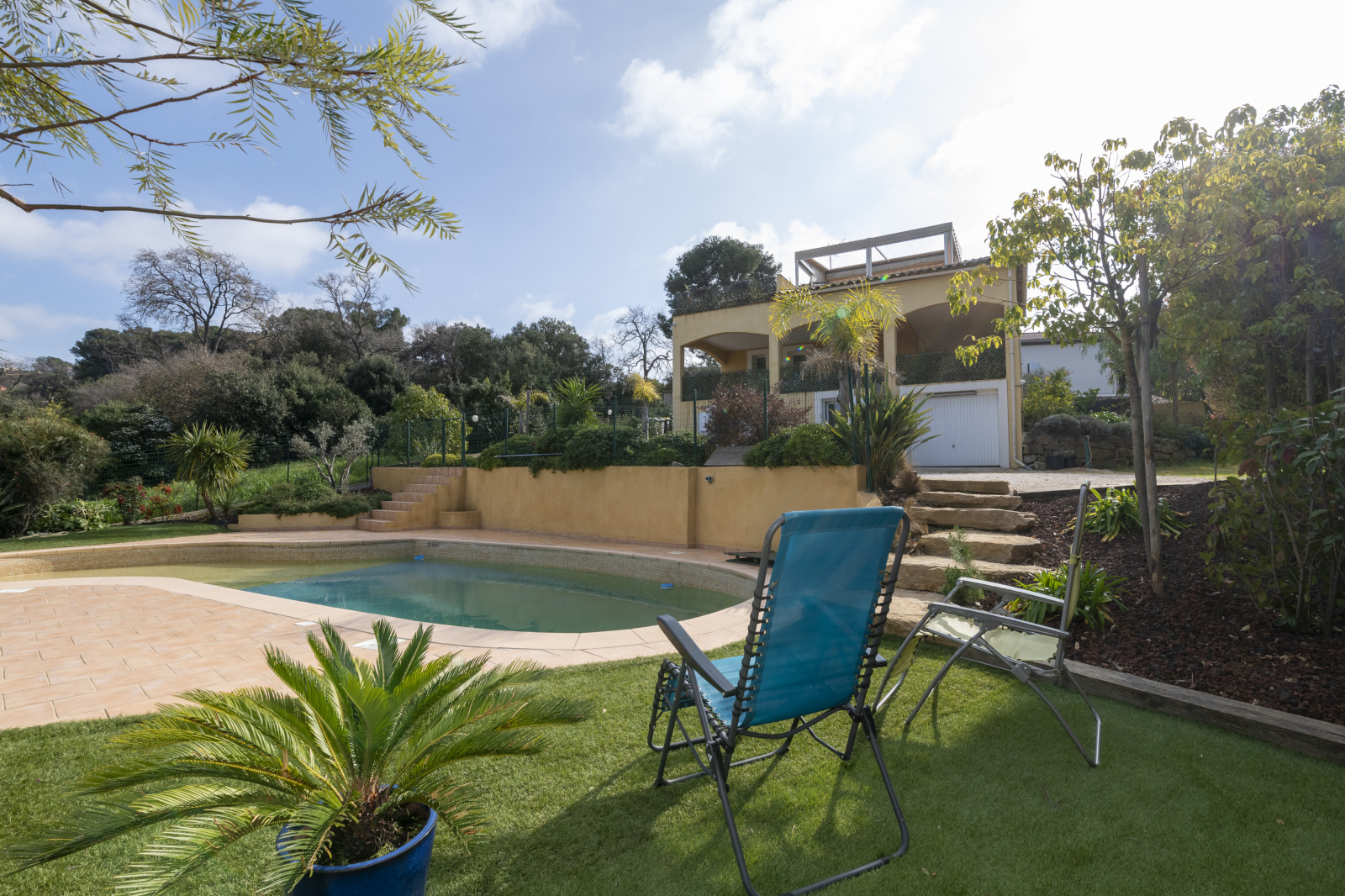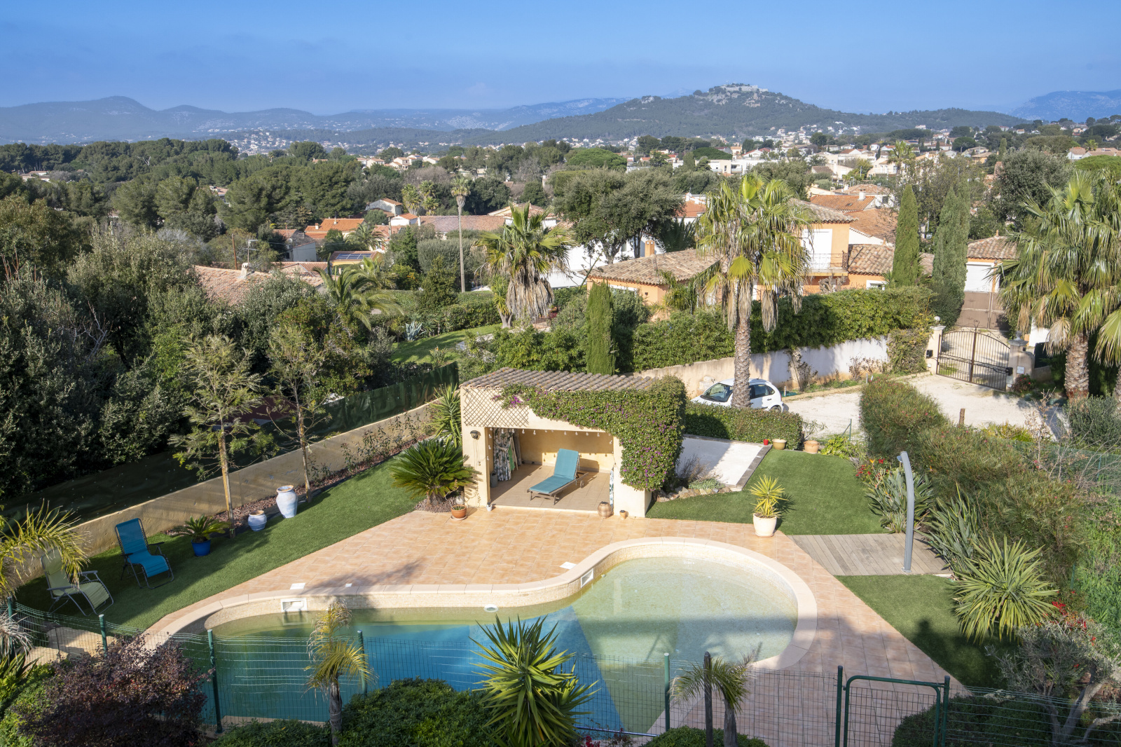 À seulement 1,9 km du port du Brusc, cette villa climatisée développe 140m² hab., complétés par un studio de 45m² et un garage de 63m². La maison a été pensée pour privilégier la lumière et la vue mer. Les espaces de vie sont situés à l’étage, où l'espace séjour–cuisine avec plafond cathédrale s’ouvre à la fois sur une spacieuse terrasse avec vue dégagée jusqu’à la mer et sur une loggia fermée aménagée en "jardin d'hiver", véritables lieux de vie supplémentaires, idéal pour profiter pleinement du panorama et des couchers de soleil. En rez-de-jardin, l’espace nuit accueille 3 chambres donnant toutes sur une vaste terrasse abritée, un bureau et une sdb, offrant un cadre calme et fonctionnel, bien séparé des pièces de réception. Le terrain de 1.180 m² propose un agréable espace détente avec piscine et pool house, parfait pour les beaux jours. Le studio indépendant constitue un vrai atout : idéal pour recevoir famille et amis, créer un espace professionel ou envisager un rendement locatif.